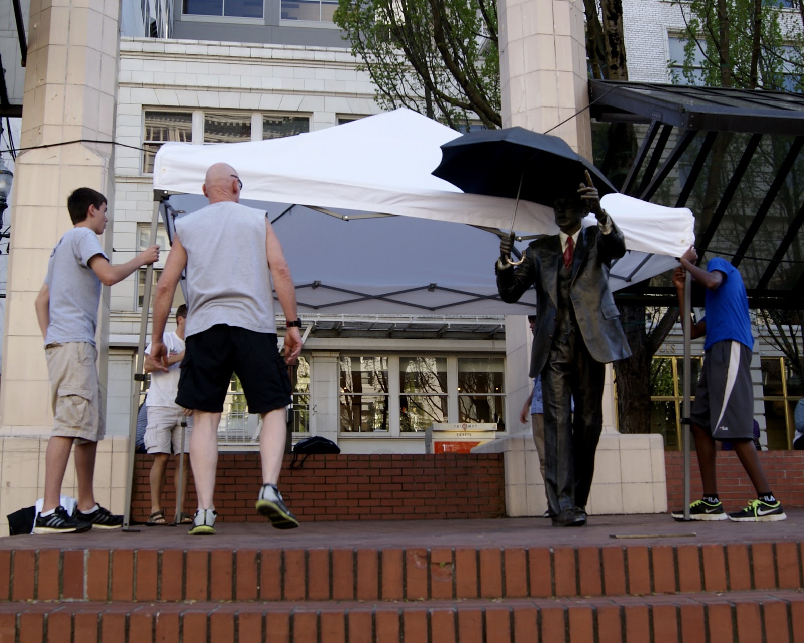 Tommorow is the Cinco de Mayo Run and Walk. Today the Square has to be setup to prepare for the runners and walkers who start arriving at 6:30am on Sunday. The setup crew has to put up the tents and tables for registration, vendors and comfort stations. It’s a job that requires a lot of planning and hard work. I thought my readers would like see the preparations that go into preparing the Square for the big event. Thanks for all the hard work guys. Umbrella Man got into the action along with everyone else. There is no limit to his dedication to the success of the events held on the Square.